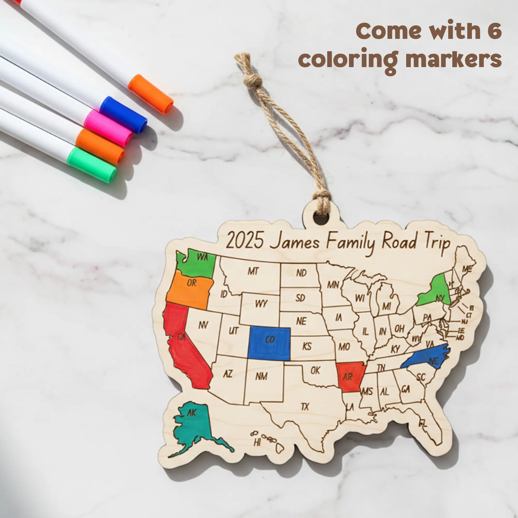 Crafted from high-quality Baltic Birch wood, this customizable USA map lets you mark the states you’ve visited and record your adventures. Choose between a hanging ornament or a refrigerator magnet, add your custom text, and use the included coloring markers to make it truly your own.