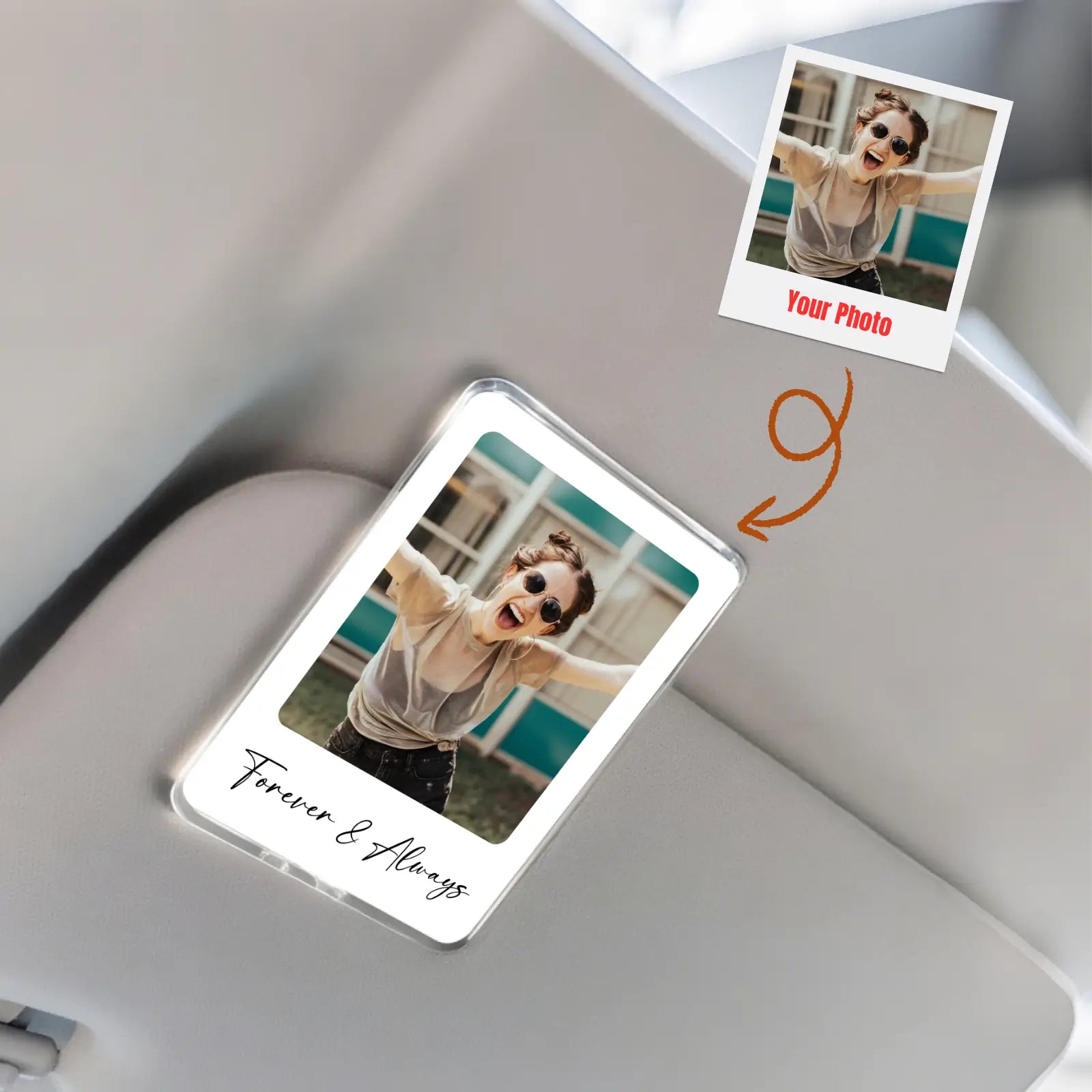 Keep your favorite memories close, even on the go! Our Personalized Car Visor Photo Clipfeatures a custom photo framed in a stylish, Polaroid-inspired acrylic design with a soft LED backlight. Easily clip it to your car’s sun visor to brighten every drive with a special moment or loved one. Add your own text—like “Forever & Always”—for a truly unique touch.